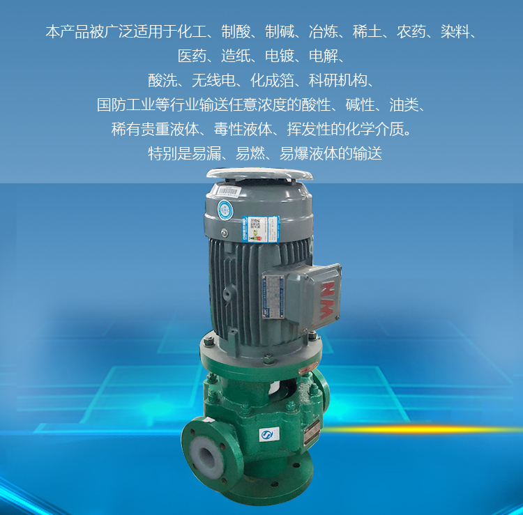氟塑料管道泵又稱其為塑料管道泵、襯氟管道泵、四氟管道泵、耐腐蝕管道泵、襯塑管道泵、立式離心泵、立式管道泵,氟塑料管道泵是單吸單級離心泵的一種,因其進出口在同一直線上,且進出口口徑相同,仿似一段管道,可安裝在管道的任何位置故取名為管道泵(又名增壓泵)。氟塑料離心泵另有:IHF-D短支架型、IHF-L長支架型、FSB-D短支架型、FSB-L氟塑料離心泵。